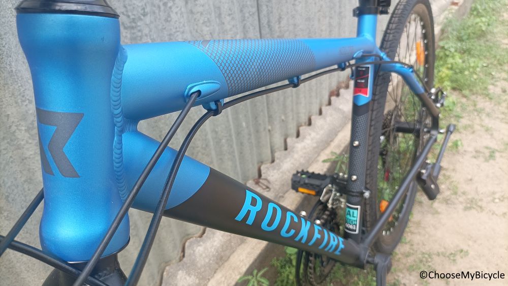 The Hustle Sport which we test rode came in a Matte Serene Blue frame colour with Black as the secondary colour for decals and graphics. The top tube is well designed with sleek tubing. The superior quality paint job was shiny and enhanced the colour shades immensely.