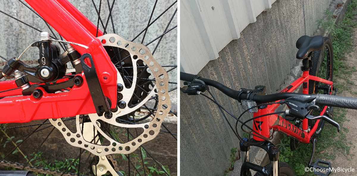 The Rockfire Ridge 29 is installed with Mechanical Disc brakes. The Logan Mechanical Disc brakes were powerful and balanced during the test ride. These brakes are powerful and make this MTB capable of handling the wettest and roughest of trails.The stock handlebar was wide and comfortable to hold on to. The slight raise from the middle of the bar made the riding posture comfortable.