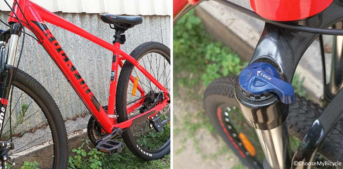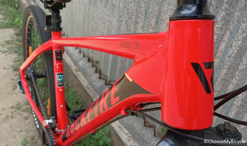 The Bicycle which we test rode came in a Red primary colour and Black as the secondary colour for graphics in a gloss finish. The block pattern on the top tube, along with sharp edged lines gives a refreshing new outlook to the frame graphics. The colour coded graphics on the suspension fork, rims and saddle make the Bicycle look uniform in design. The bulky treads on the tires add to the much needed rugged look of this MTB.