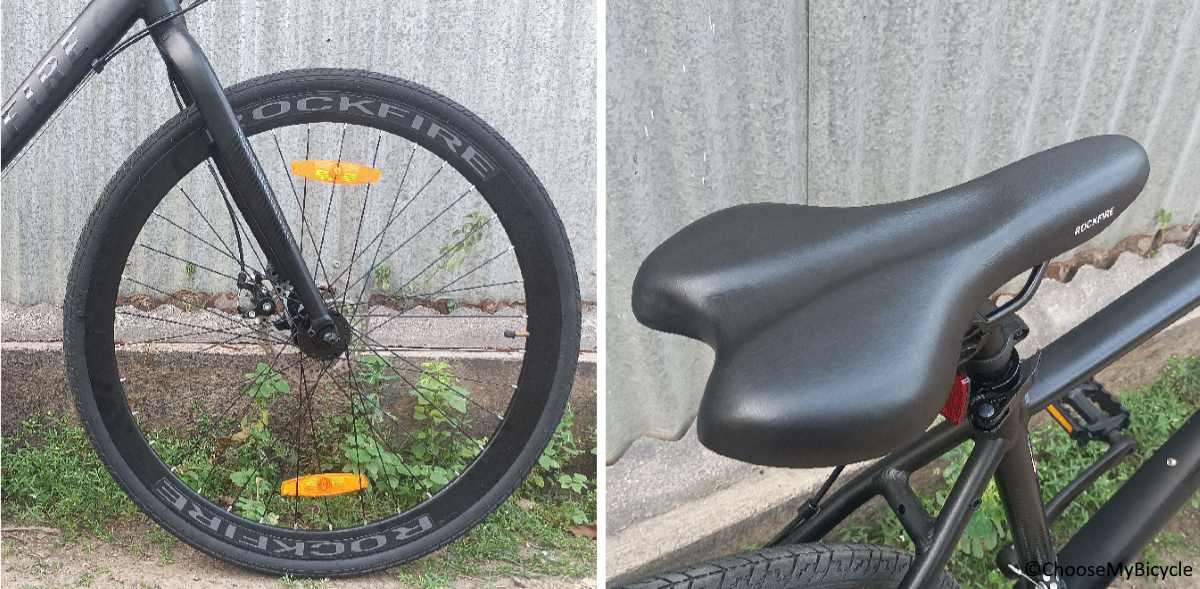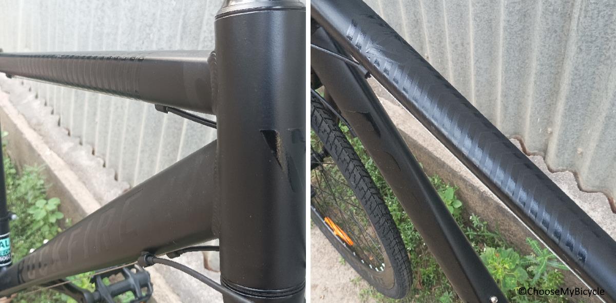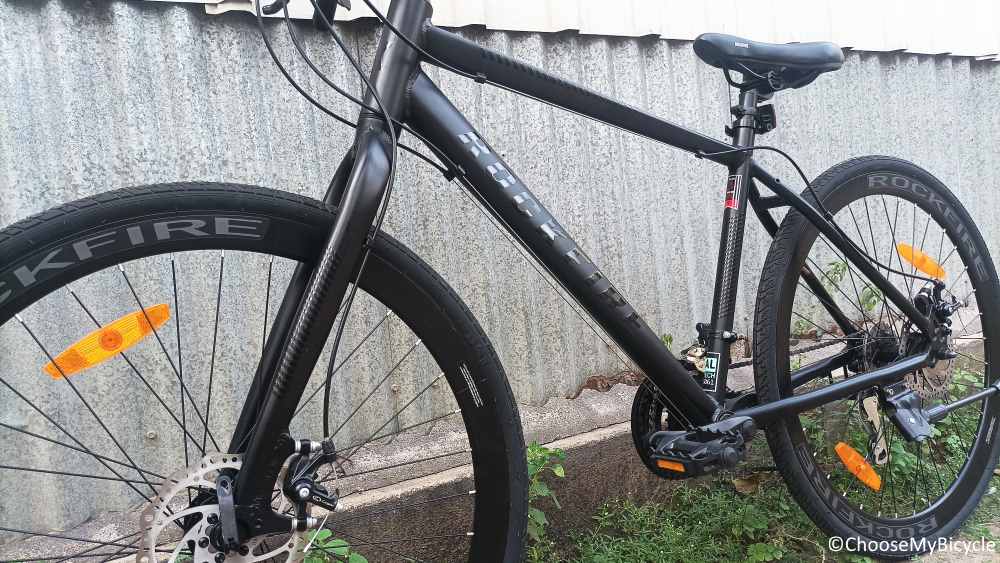 The Rockfire Urban Sport comes in a full Matte Black colour frame with Gloss Black graphics. The matte finish paint job and the quality of the gloss decals were top notch and made the frame look stylish. The thin seat stays and chain stays made the Bicycle look sleek. The graphics and design were minimal and classy.