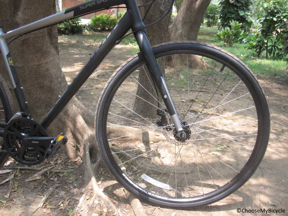 The Schwinn Super Sport comes equipped with fast rolling 7x35C hybrid tires. These tires were lightly treaded, ensuring great grip while turning at sharp corners. Additionally, they ensure added stability and control in wet riding conditions and on uneven terrain. The wheels come with a Quick Release Option at the front and back. The Schwinn S2 Sport Ergo saddle that comes on this bicycle is well designed to comfortably accommodate one's sit bones. However, I feel that the saddle was on the harder side, especially when on longer distance rides. A point worth mentioning is the design of the Quick Release that has a curvature to fit perfectly onto the seat tube while being locked.