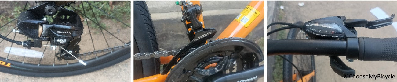 The 21-Speed drivetrain on the Toronto H2 is a combination of a 3-speed Shimano Tourney as the front derailleur, and a 7-speed Shimano Tourney as the rear derailleur. Shifting was good across gears, with hardly any lags felt during the test ride. This gear combination is ideal in performance for commutes and long distance fitness rides. The drivetrain is controlled by Shimano EF5 21-Speed shifters, which were positioned well and easy to use.