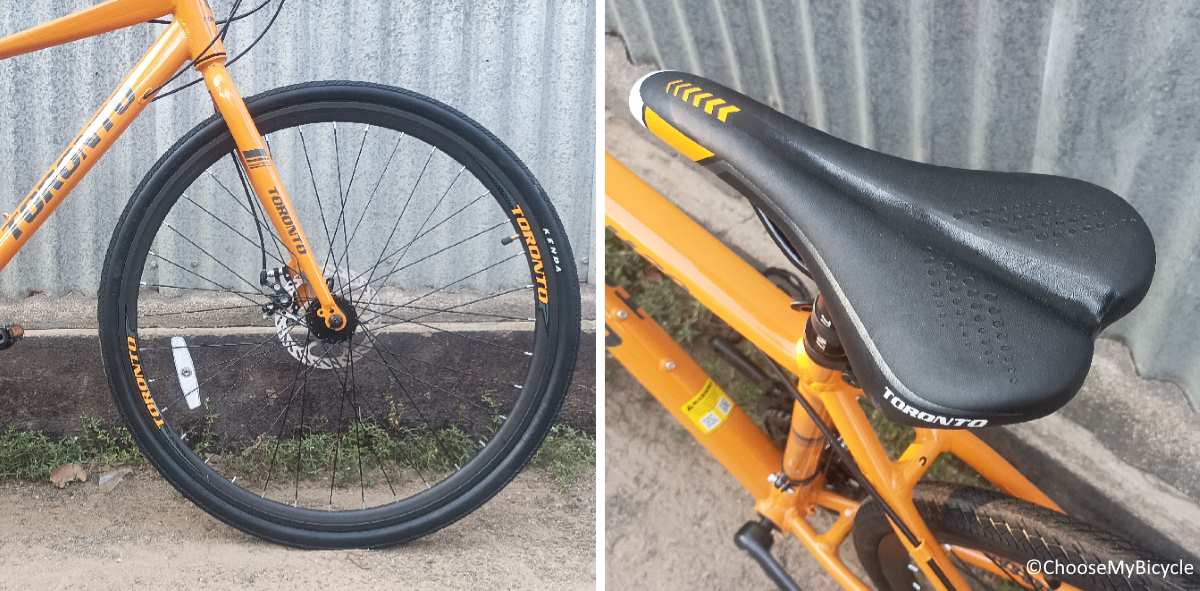 The Toronto H2 rolls on a pair of 7x35c Kenda tires that are fixed on to Double Walled Alloy rims. The treading and size of the tires were ideal for city commuting and long rides. The rolling resistance was fast and the tread pattern provided enough traction on wet roads as well.The stock saddle has an ergonomic shape and build to it but could have had more cushioning for better comfort.