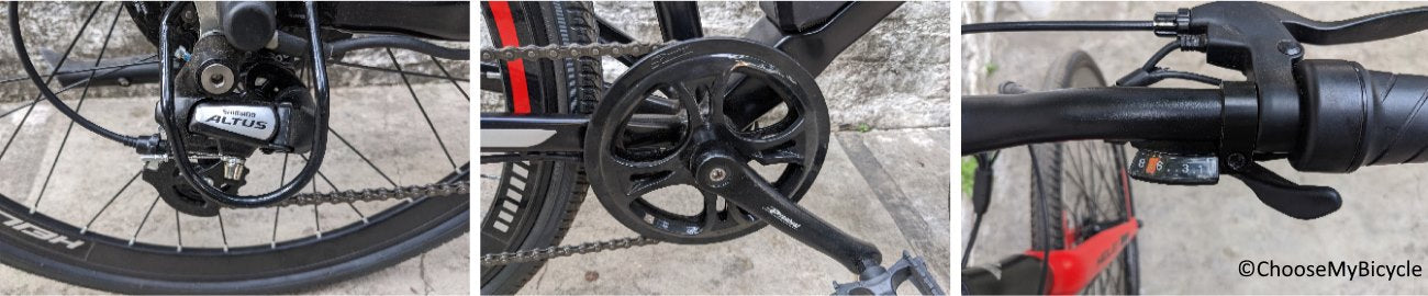 This Electric Hybrid Bicycle is equipped with a simple 1x8-Speed Shimano Altus drivetrain. This means there is no front derailleur and the rear has an 8-Speed Shimano Altus M31 derailleur. Gears generally help in increasing or decreasing the pressure in pedalling. This 8-Speed Shimano Altus gears helps in 2 things; for exercise purposes and also to pedal easily if in case the battery power runs out during a ride. The Shimano shifters were sleek and were easy to shift with clear gear indicators.