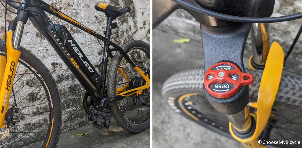 The Toutche Heileo M2 9.6AH is a Hardtail Electric MTB which is built on an Aluminium Alloy frame. This frame is strong enough to handle rough surfaces at high speeds. The strength seems to come mainly from the strong headset area where the top and bottom tubes merge, which can absorb vibrations of the surface. The slightly slanting top tube gives extra standover clearance for the rider. The tubes are neatly welded and look smooth in the joint.The stock front suspension fork on this MTB comes with a 1mm travel ensures smooth riding on bumpy roads and trails. The manual suspension lock-out helps make the suspension rigid and ride faster on flatter surfaces.
