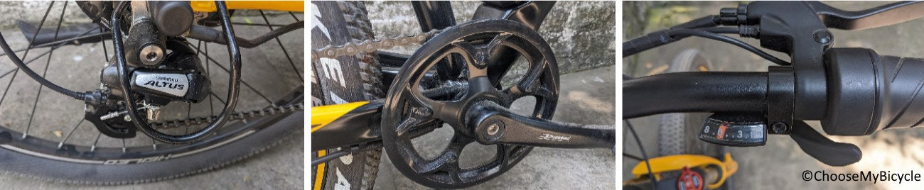 This Electric Bicycle is equipped with a simple 1x8-Speed Shimano Altus drivetrain. This means there is no front derailleur and the rear has an 8-Speed Shimano Altus M31 derailleur. Gears generally help in increasing or decreasing the pressure in pedalling. This 8-Speed drivetrain helps in 2 things; for exercise purposes and also to pedal easily if in case the battery power runs out during a ride. The Shimano Altus shifters were sleek and were easy to shift with clear gear indicators.