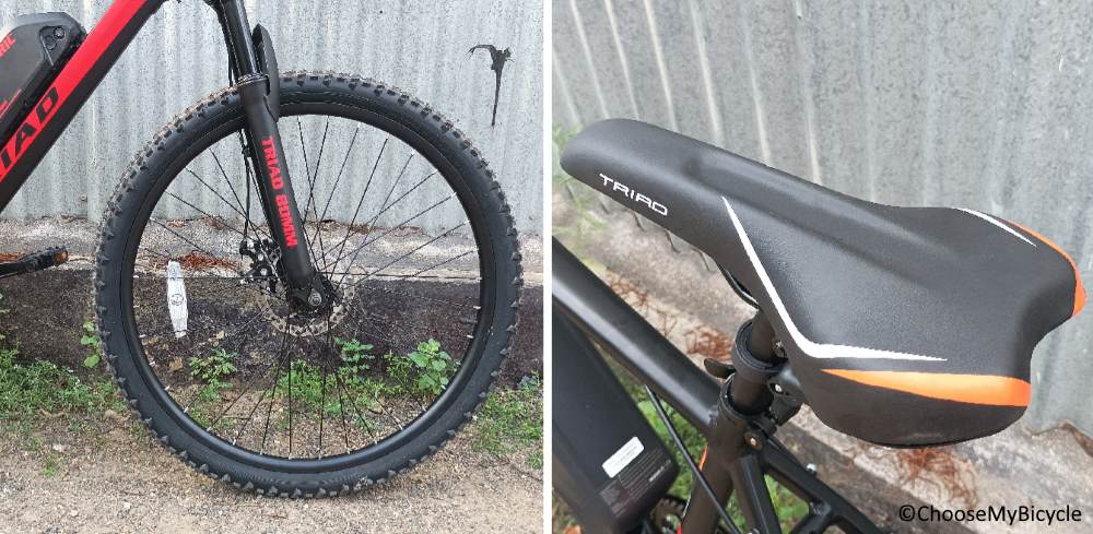 The Triad E3 Pro comes with DSI 26” x 2.” MTB tires. The heavy treading on the tires enabled rolling over any hard surface with ease. The 26” tires are fast rolling and the treads helped easily roll over rough surfaces. The saddle on this Electric Bicycle was sufficient for soreness free rides on bumpy surfaces, but this saddle could use some extra cushioning for added comfort.