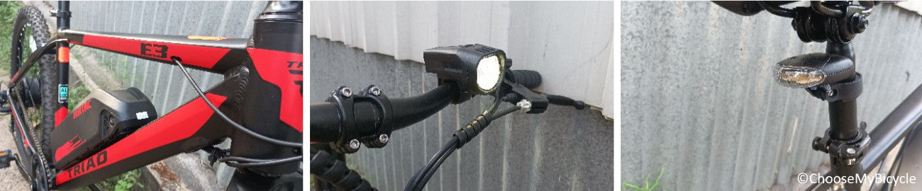 The Triad E3 Pro comes in a full Black primary colour with Red as the secondary colour for graphics and text. The matte finish paint job was top notch in quality and finish. The battery pack on the bottom tube has colour coded graphics and is shaped in such a way that it blends in with the frame triangle. The front and rear LED lights were stylish in design and were not only useful features for visibility in the dark but also enhanced the aesthetics of this Electric Bicycle.