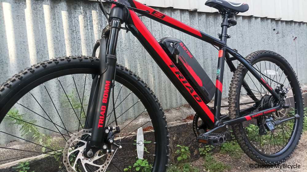The Triad E3 Pro Electric Hardtail MTB is built on strong full Alloy frame. The frame geometry is standard with a slightly slanting top tube which gives extra standover clearance for safer riding. The riding posture is comfortable and the Alloy frame absorbs quite a bit of vibrations of the surface when riding through bumpy surfaces and flat trails at higher speeds. This frame comes in a standard 18 inch frame size. The frame has seen an upgrade in terms of build quality when compared to the previous version of the E3. The Triad E3 comes with a front suspension fork with an impressive 8mm travel. During the test ride this suspension fork helped riding smoothly over rough roads.