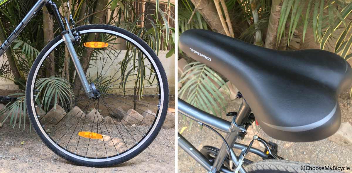 A pair of Power V-brakes handle the braking on the X2 Cross. While many entry-level Bicycles are moving to Mechanical Disc brakes there are only a handful of Bicycles which are still using V-brakes. Good quality V-brakes like the ones used in Triad X2 Cross are as good as and sometimes even better than most Mechanical Disc brakes, in terms of stopping power and easy maintece. This raiser handlebar was wide and gave an open chested riding posture. The stem is adjustable and lets you raise the handlebar height vertically. This makes the riding posture even more comfortable and straight backed.