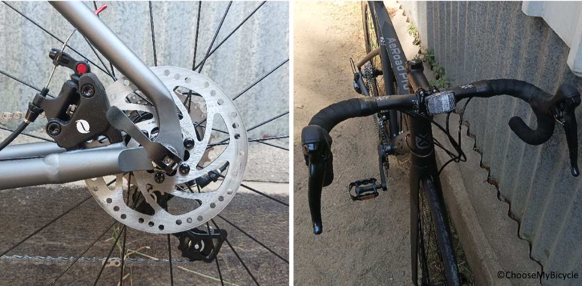 The Unirox AeRoad Pro comes equipped with Deca Disc brakes. When tested, both interval and abrupt braking was sufficient while remaining stable and in control. The braking was as effective on both dry and wet terrain on the test ride.This Bicycle comes equipped with a stock Alloy handlebar. The compact shape of the handlebar enables the rider to place their hands on the drop bar without being in an overly aggressive, strained riding position.