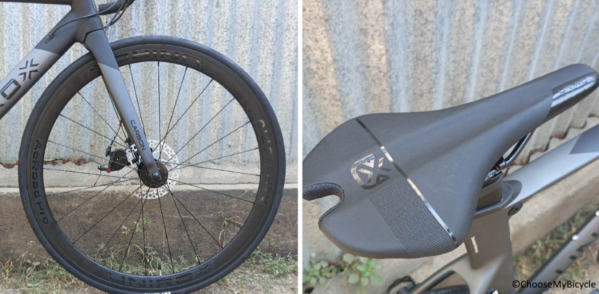 The Unirox AeRoad Pro comes equipped with fast rolling and sleek CST 7x25C tires which are attached to stock Alloy Double walled rims. The tires offered a smooth and fast ride. Cornering felt stable, allowing for crisp sharp turns while being stable.This Bicycle comes equipped with an ergonomic road specific stock saddle. The saddle offered a level of support and cushioning that is well suited to a rider on faster, short-distance and long rides.