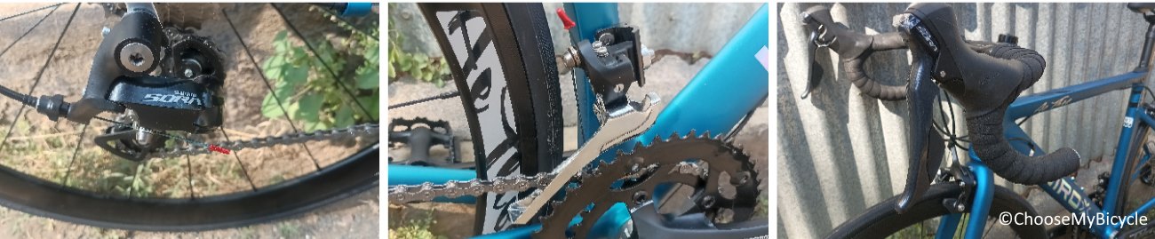 This Unirox AeThos comes equipped with Shimano Sora front and rear derailleurs. This 18-Speed Bicycle is fast when on the road, tackling climbs and flat roads with ease. The 18-Speed shifting is controlled by Shimano Sora single lever paddle Shifters which require minimal effort to shift. The shifting was lag-free with these Sora derailleurs.