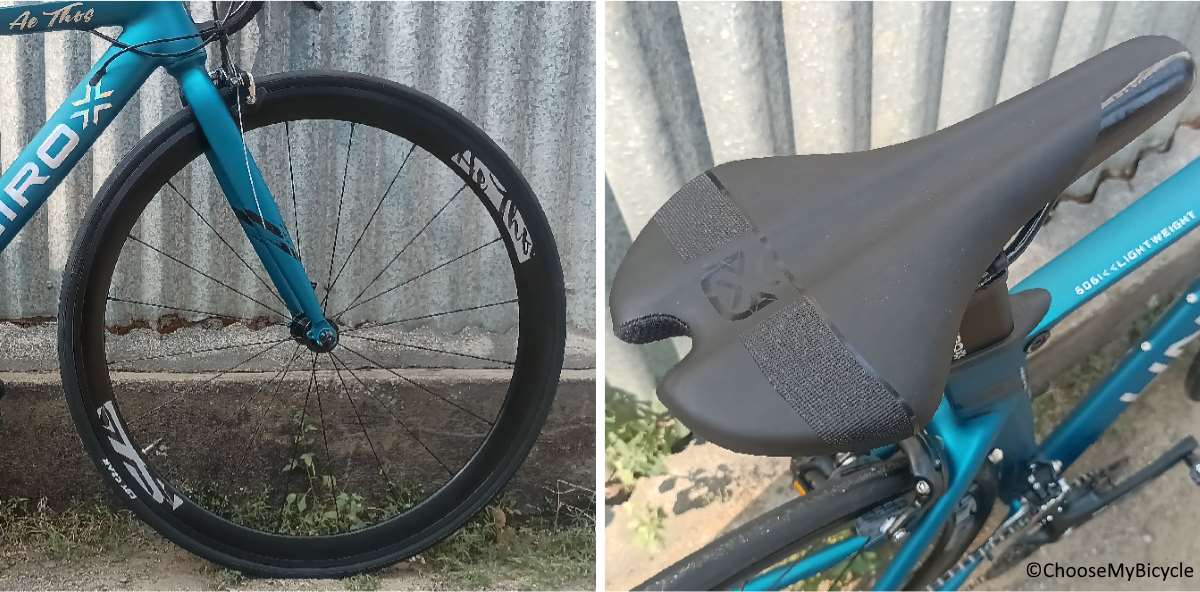 The Unirox AeThos comes equipped with fast rolling and sleek CST 7x25C tires which are attached to stock Alloy double walled rims. The tires offered a smooth and fast ride. Cornering felt stable, allowing for crisp sharp turns while being stable.This Road Bicycle comes equipped with an ergonomic road specific stock saddle. The saddle offered a level of support and cushioning that is well suited to a rider either on short-distance or long rides.