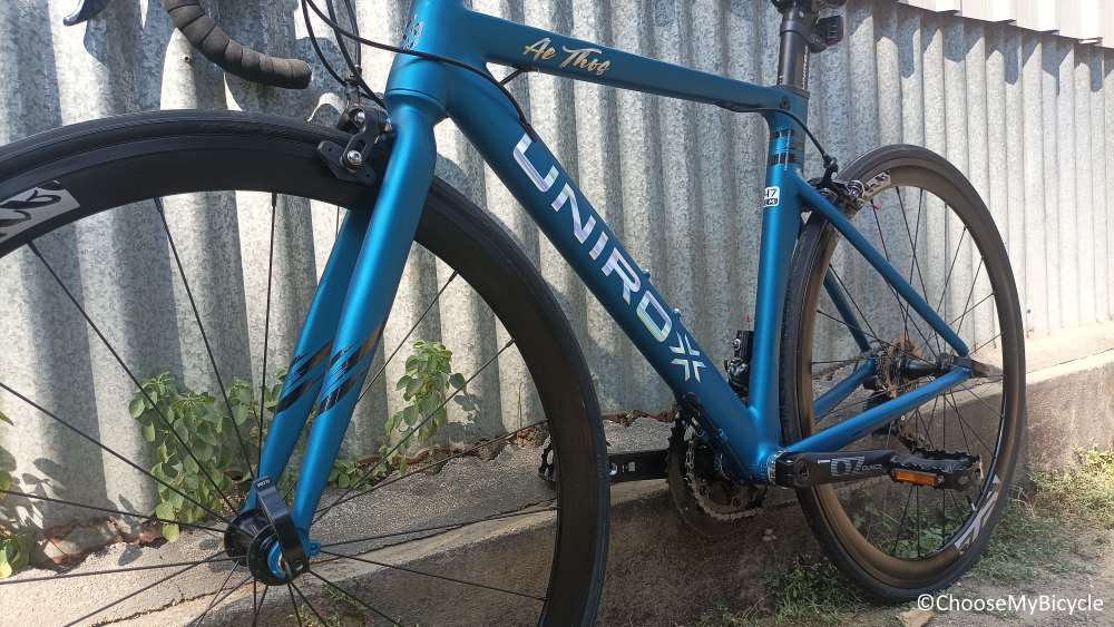 The Unirox AeThos has been made using Aluminium Alloy, which is perfect to achieve an excellent speed-to-comfort ratio. The design of the tubes ensures supreme performance on all kinds of terrain – tested on cobblestones and flat tarmacs. The performance across all road surfaces was impeccable. This welding technology used on the frame of this Bicycle adds to its lightweight.This Bicycle comes equipped with a full Alloy fork. This lightweight yet strong fork absorbs shocks upto a limit which is felt from riding on cobblestones, and/or bumpy, rough terrain efficiently.