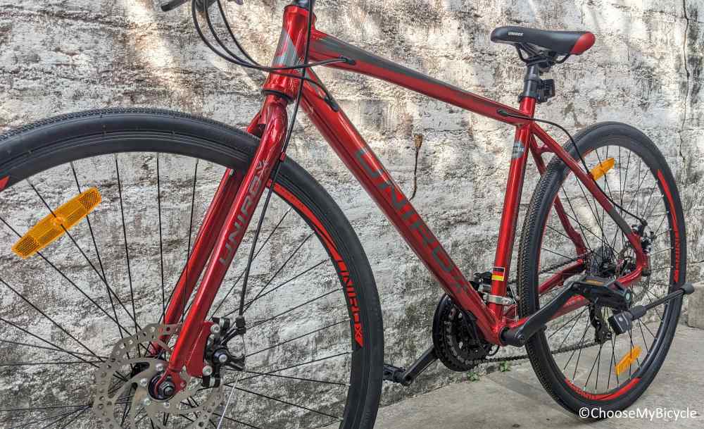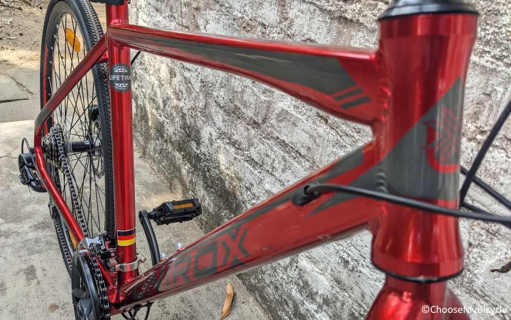 This Unirox Milan Bicycle is a good-looking Hybrid. The frame design and eye catchy tube profiles, along with smooth welds, translates to the Milan being an aesthetic Hybrid. The bicycle which we test rode came in a full Red (Maroon) primary colour and Grey as the secondary colour for graphics and text. The gloss finish paint job was top notch in quality.