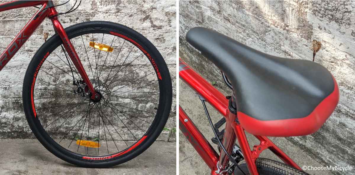 The Unirox Milan DS 7C rolls on a pair of 7x35c tires that are fixed on to double walled alloy rims. The treading and size of the tire were ideal for city commuting and long rides. The rolling resistance was fast and the tread pattern provided enough traction on wet roads as well.The stock saddle has an ergonomic shape and build to it but could have had more cushioning for better comfort.