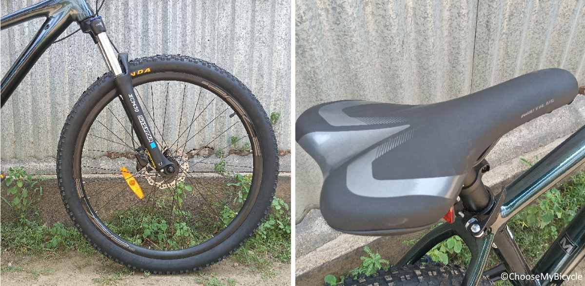 The Kenda MTB tires impressed us during the test ride. The 27.5” x 2.25” tires were heavily treaded with bulky buttons and covered the edges as well. These tires were fast rolling on flatter surfaces and could handle rough patches with ease. The stock Trail specific saddle was wide with enough cushioning.