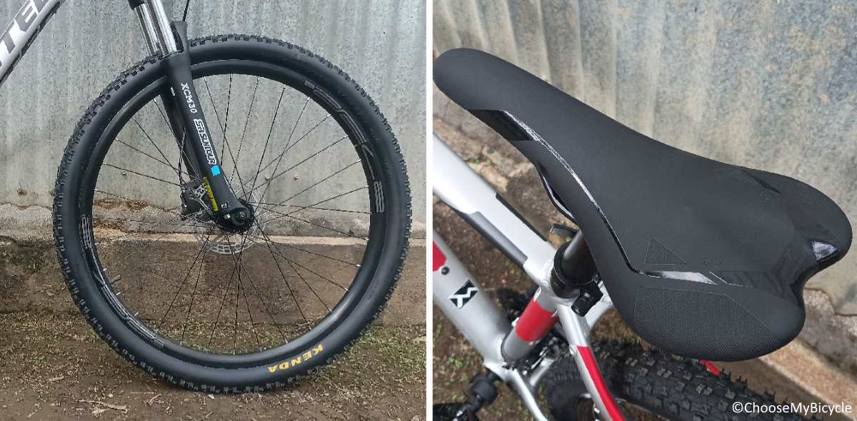 The Kenda MTB tires impressed us during the test ride. The 27.5” x 2.25” tires were heavily treaded with bulky buttons and covered the edges as well. These tires were fast rolling on flatter surfaces and could handle rough patches with ease. The stock Trail specific Saddle was wide with enough cushioning.