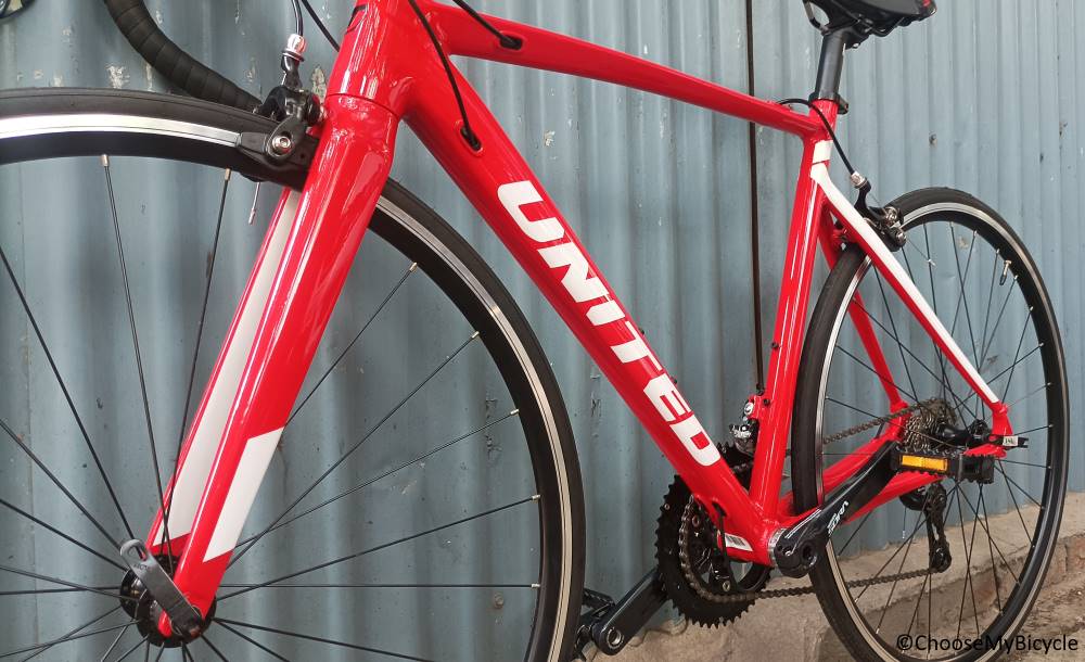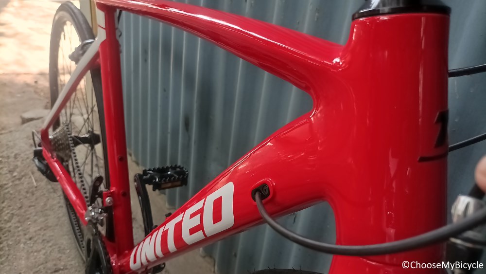 The United Vitessa 1. is a well-designed Bicycle. The smooth welding on the frame joints adds to the overall aesthetics of this Bicycle. The Bicycle we test rode came in a Gloss Red primary colour with White as the secondary colour. The branding on the frame of this Bicycle is significant while not being overpowering. The thin tubes made the Bicycle look sleek and lightweight.