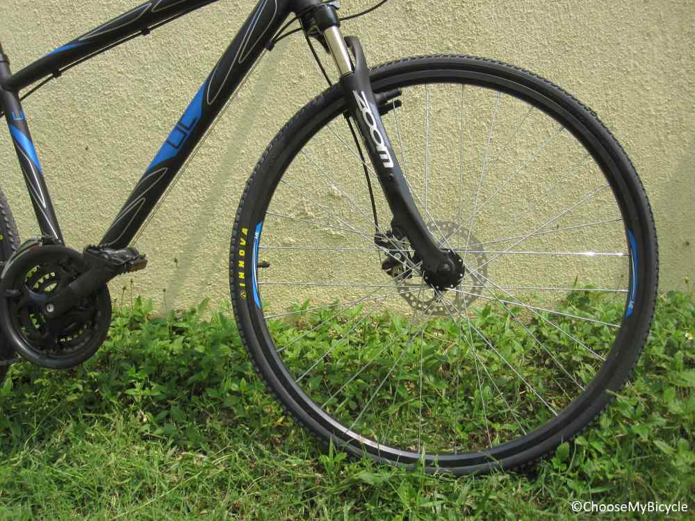 The Urban Trail H2D (2015) comes with a full alloy frame which was welded to perfection on all the tube edges. The top tube is slanted from the top near the headset to the bottom near the seat post. This slant is very evident and makes the bicycle easy to hop on to and gives the rider a better stand-over and saddle posture. The down tube which begins near the headset is chunky and then lessens in thickness as it goes down. This makes the frame have more material at the most vulnerable places to absorb vibration of the surface.This UT hybrid bicycle comes with a front suspension fork. The Zoom branded suspension fork worked well during the test ride on some rough roads. The suspension lock-out feature helped rider ride faster on flat roads.