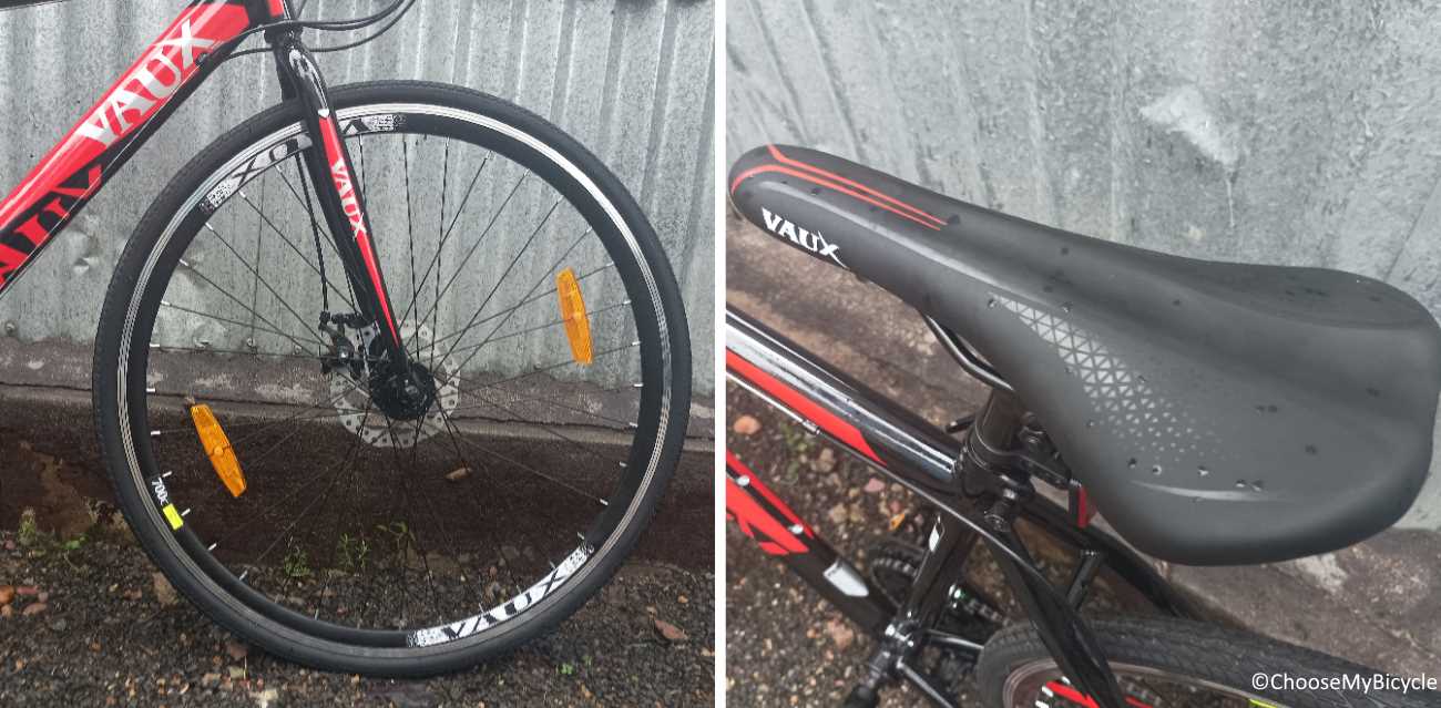 The Vaux Swifter 7x35C Hybrid tires were sleek, during the test ride these tires proved its worth by rolling over urban roads with ease. The wheel sets are strong and could handle the bumps on the road. The stock saddle on this Bicycle was padded well which ensured the rider was soreness free even after riding on rough roads.