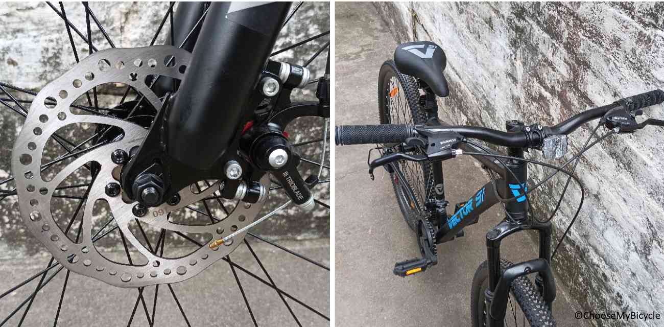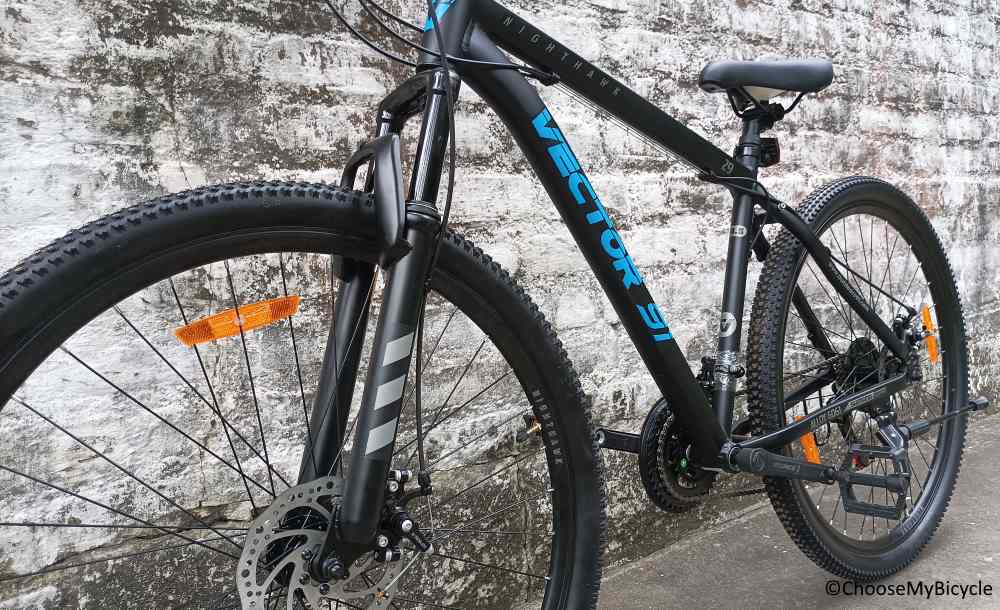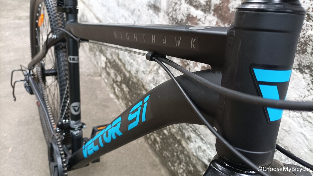 The Night Hawk 29T from Vector 91 which we test rode came with Black as the primary colour and Blue as the secondary colour for the graphics and text. The black saddle with a graphic is eye catching and the Black brake cables were a nice touch to keep the Bicycle colour coordinated.