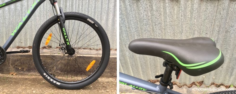 The WaltX Trail 27.5 rolls on a pair of DSI 27.5” x 2.1” tires. The ‘raised button’ treading on the tires is placed close to eachother which offers added grip. When on rugged roads, the treading works well to grip the surface and offer added balance and stability, even when on turns. 27.5” wheels are versatile as they are road friendly as well as trail friendly, and are able to tackle well-paved roads, soft muddy surfaces and harsh natural trails with ease. The wheels are equipped with a QR option on the front tire.As of October 1st 221 - The WaltX Trail 27.5 - Grey-Green comes with Maxxis 27.5" x 2.1" Tires.</I>The WaltX Trail 27.5 comes equipped with an ergonomic MTB saddle. The Saddle is wide enough to comfortably accomodate one's sit bones. However, I found that the saddle was slightly long and could do with a little extra cushioning. A plus is that the seat post has a QR option that enables easy and quick adjustment of the saddle height.