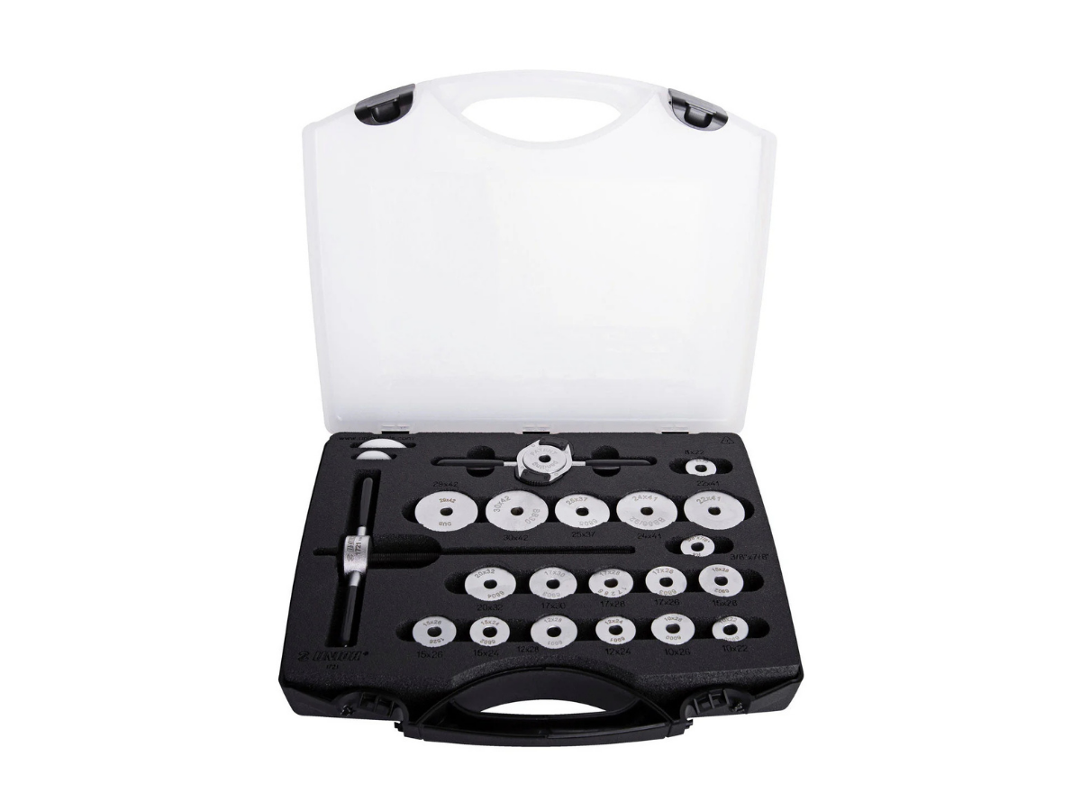 • Unior’s 1721 universal bearing press set enables the installation of bearings on most of the frames and components.
