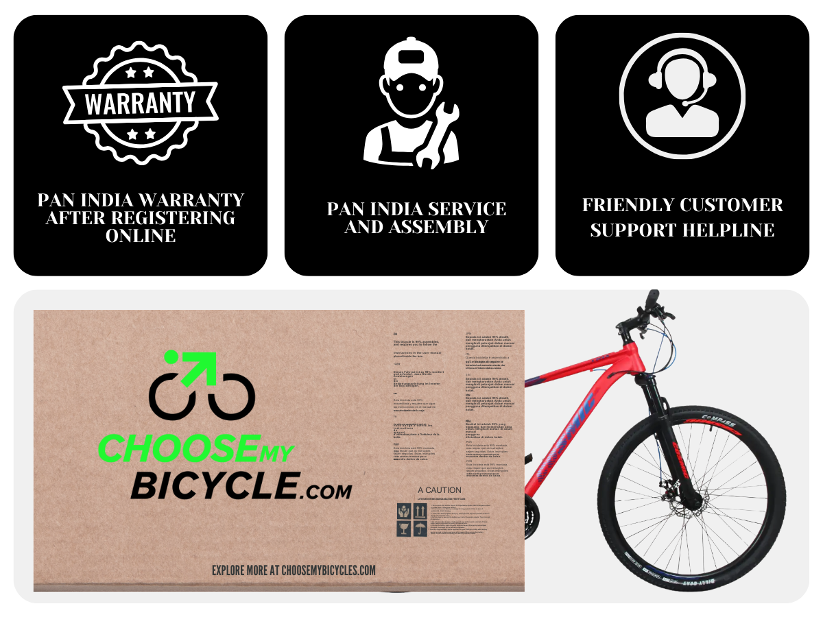 All bicycles we sell come with a standard warranty on the frame, provided directly by the brand. Contact us through our Chat Support on our website to know more warranty related details for specific products. Incase of any warranty claims pertaining to your product, contact us onsupport@choosemybicycle.com, and ChooseMyBicycle will follow the due process to help you claim your warranty through the respective brand.