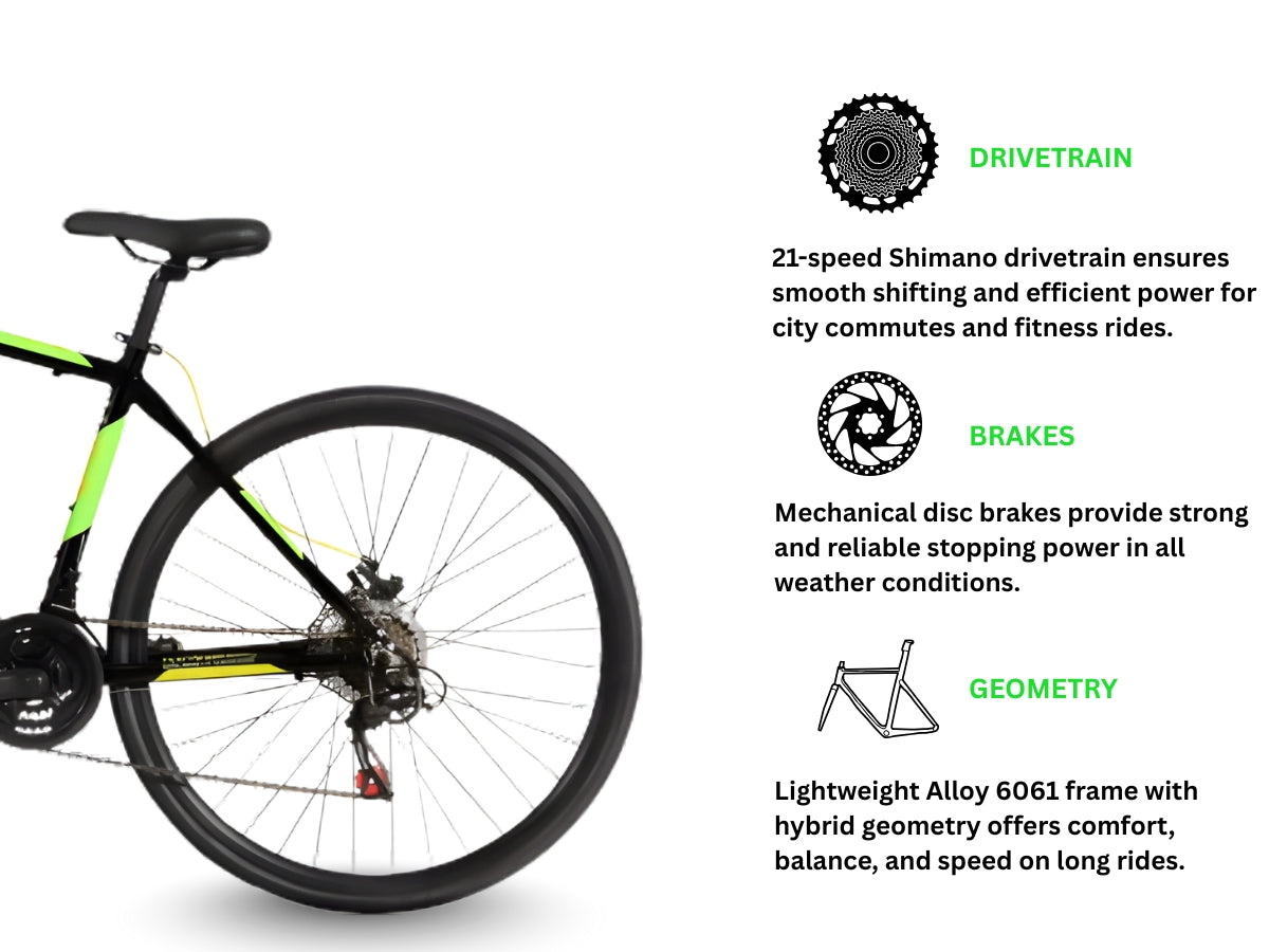 • Reliable Components – Equipped with quality Shimano gears and disc brakes.
