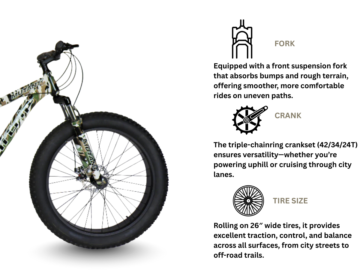 Equipped with powerful dual disc brakes, the Mutant 26 ensures reliable stopping power in all weather conditions. Whether you’re navigating city traffic or descending slopes, the braking setup offers complete control and safety.