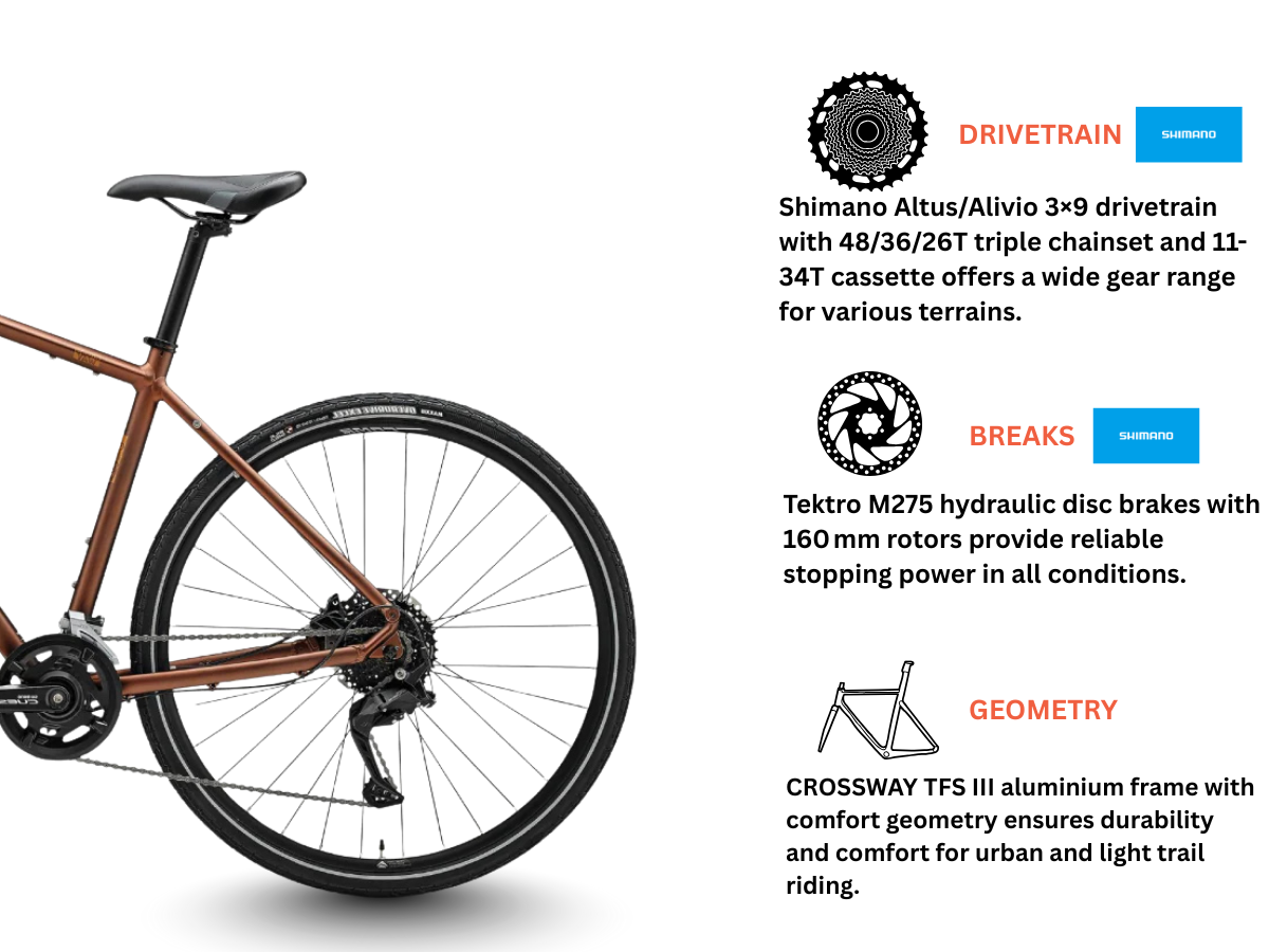 The Merida Crossway 100 (2025) is a Cross Hybrid Bicycle which is designed for Long Distance Fitness Rides on all types of Roads.