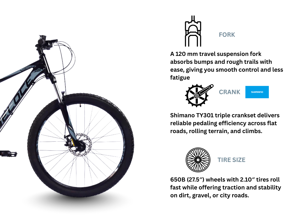 The Veloce V200 comes with a pair of 27.5" x 2.10" tires which are attached to Double Wall Alloy Rims.