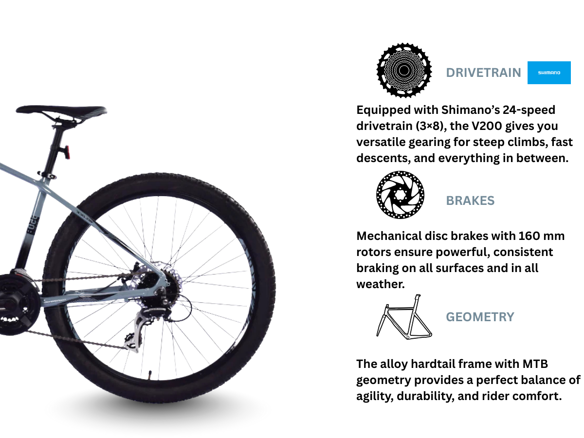 The Veloce V200 is a Hardtail Mountain Cycle which is ideal for Trail Rides and can be used for riding on bad urban roads.