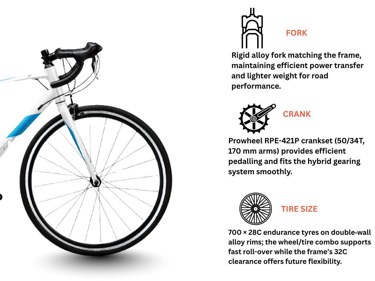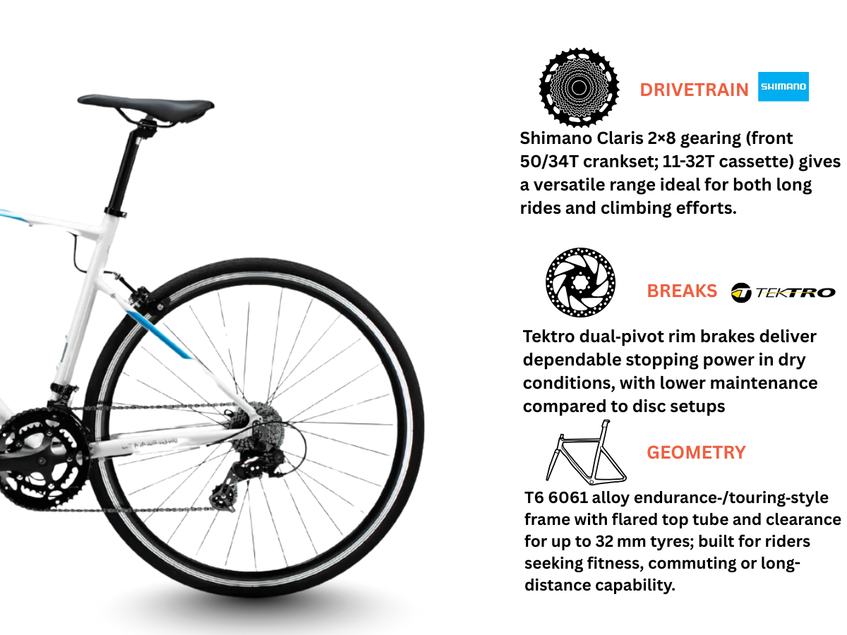 • Quality components for the segment — Equipped with Shimano Claris derailleurs/shifters and a durable crankset (Prowheel RPE-421P), this bike delivers solid performance compared to similarly priced models.