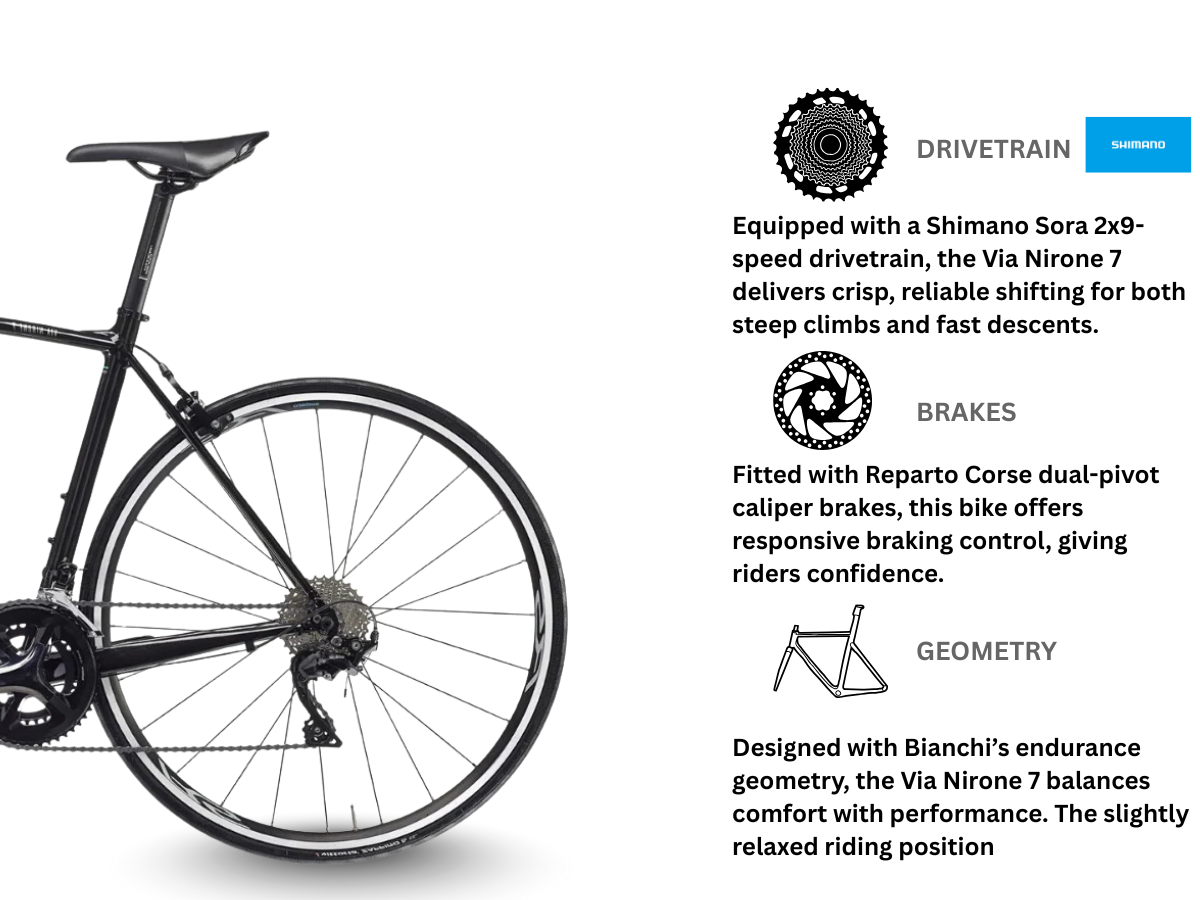 The Bianchi Via Nirone 7 Sora (2023) is a Road Bike which is built for passionate riders aiming to complete long long distance rides.