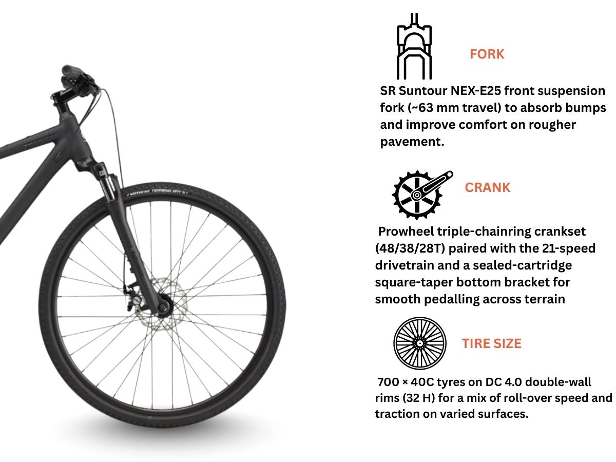 This hybrid bicycle comes with a perfomance focused 700 x 40C Tires and a DC 4.0, Double Wall w/eyelet, 32h rim