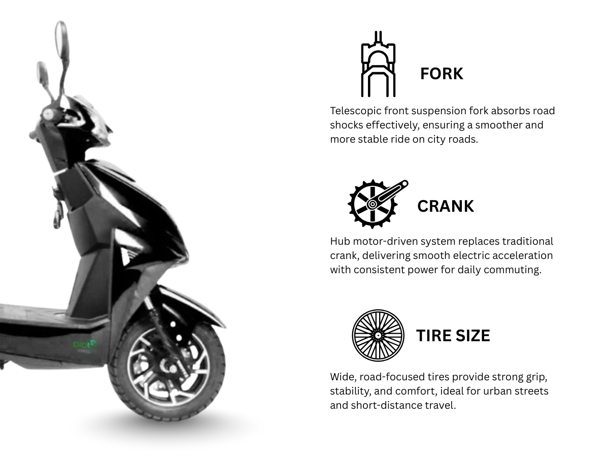 Telescopic suspension absorbs road shocks. Enhances comfort on uneven urban roads.