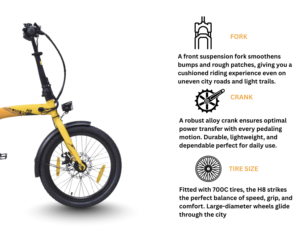 The H8 rolls on 27.5-inch tires that offer solid grip, smooth rolling, and better maneuverability. The wider profile adds safety and stability, especially on uneven or broken roads.