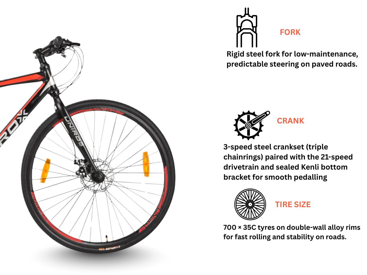 The Unirox Milan DS 700c comes with a Shimano Tourney 3x7-Speed Gear System.
