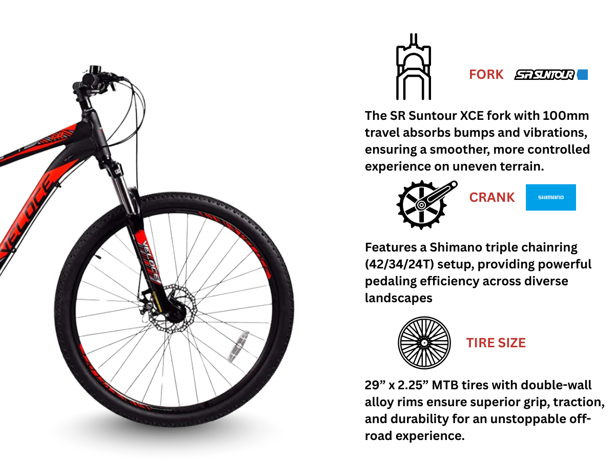 This MTB from Veloce comes with Mechanical Disc Brakes which are connected to Shimano Levers.